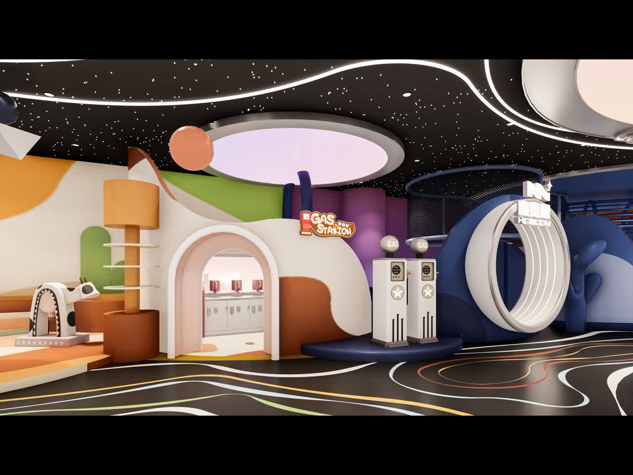Astronaut-themed attractions including rocket slides and space station rest areas, inspiring STEM interest.