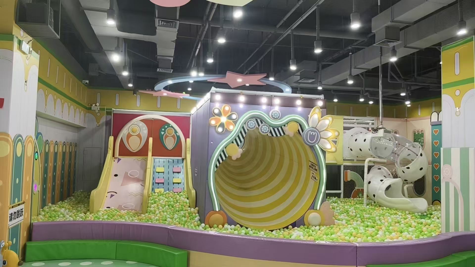 - Multi-level soft play structures with slides and ball pits